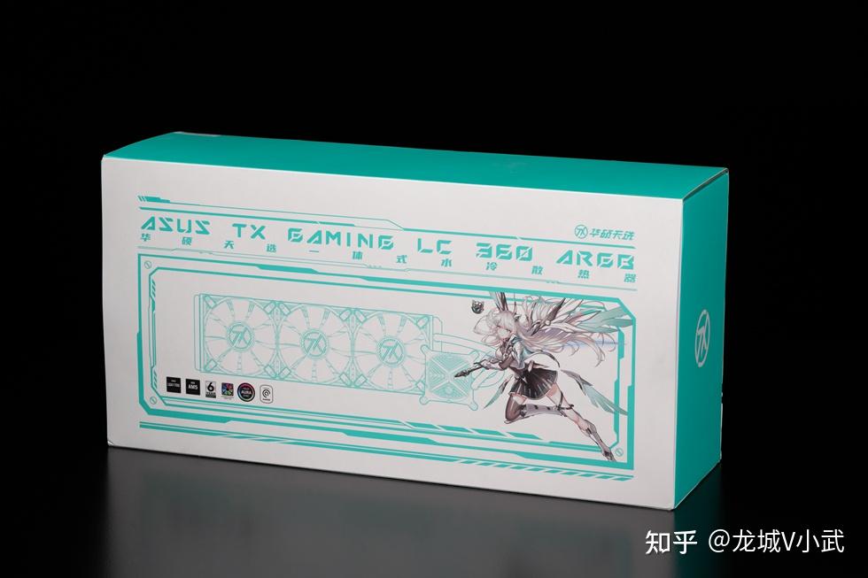 散热器采用华硕田璇游戏LC 360一体式水冷,包装盒采用白色和青色搭配,正面印有吉的卡通图案。从外包装正面的图标信息可以看出,这款水冷器由Asetek制造,支持LG1700 \ AM5双平台使用,并配备ARGB散热风扇,支持申光同步特效。官方还为这款饮水机提供6年的售后保修服务。
