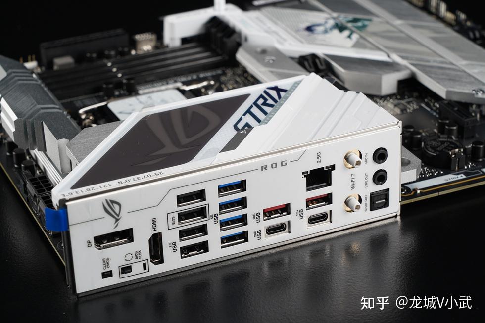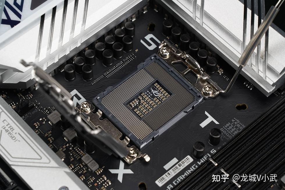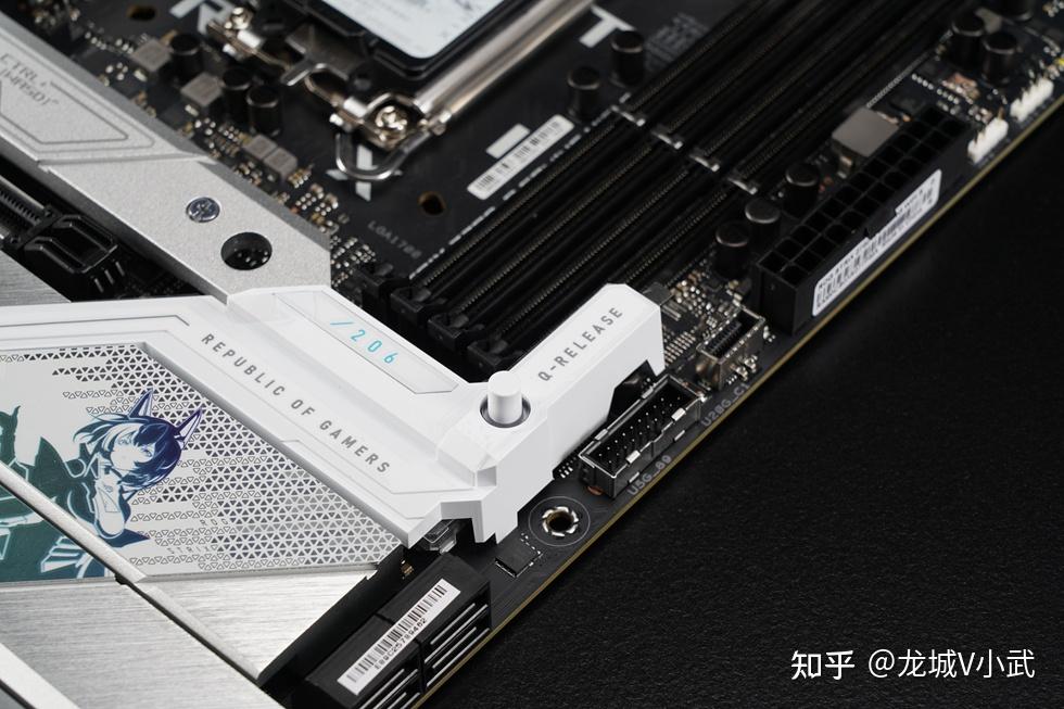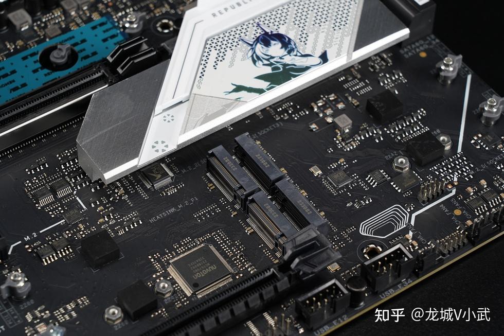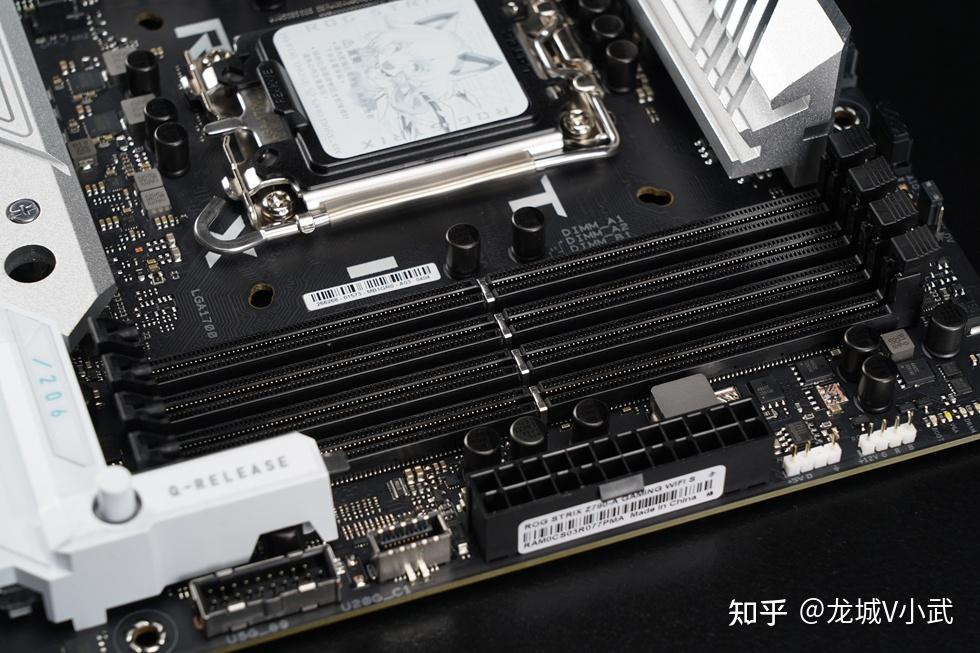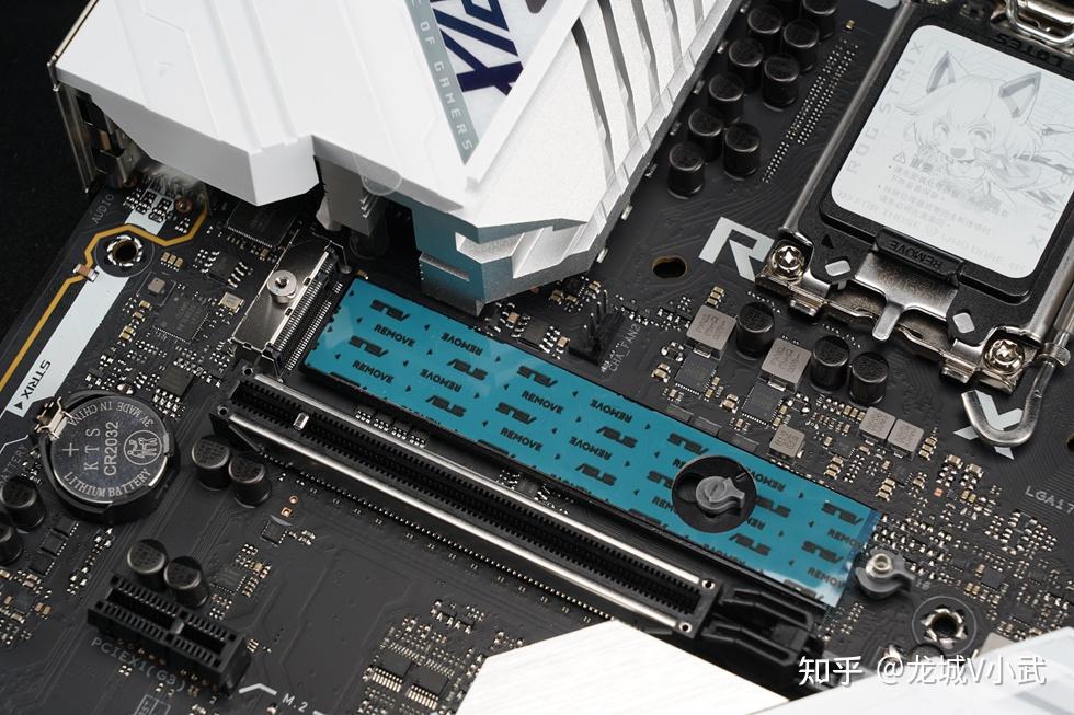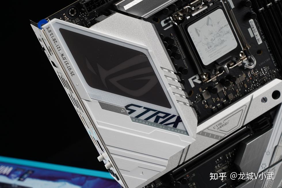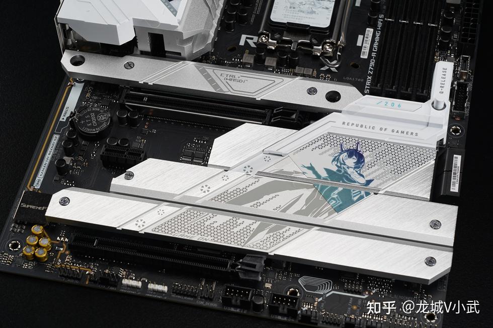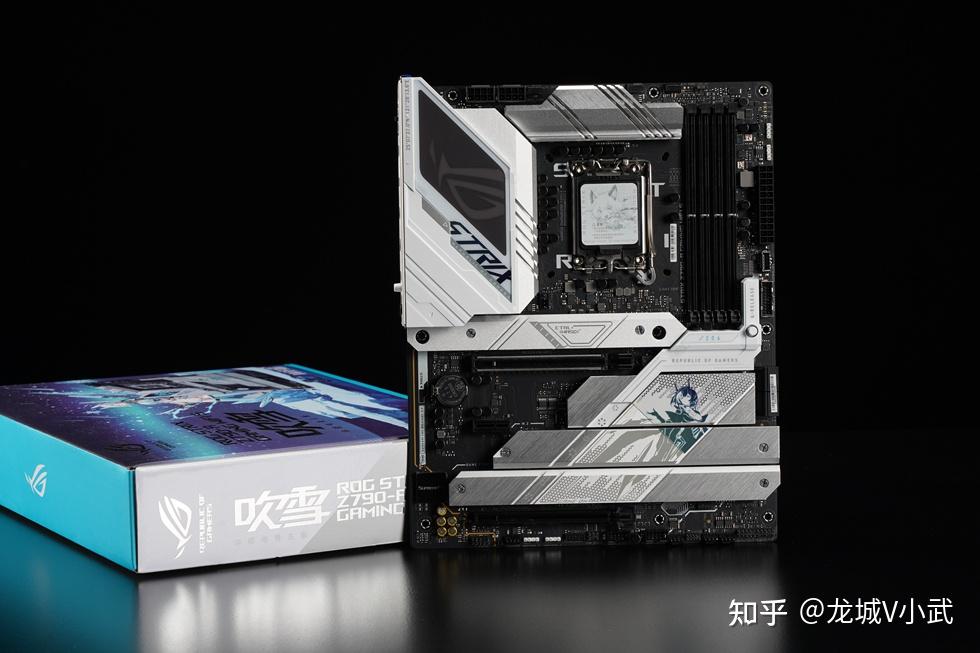 主板是来自华硕的最新ROG STRIX Z790-A游戏WIFI S,外观也延续了之前的设计。黑色PCB搭配大面积银色散热装甲,装甲的覆盖面积比上一代更多。此外,盔甲上还加入了雪舞战士的二次元动画形象。
