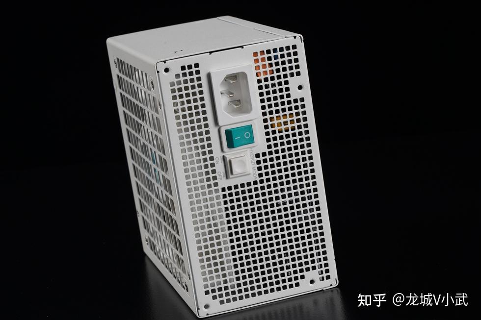 电源后部有一个很大的方形开口用于电源冷却,并且它还配备了一个单独的蓝绿色交流开关,混合动力模式按钮就在开关旁边。开启后,电源风扇在低负载使用场景下会自动停止运转,延缓风扇寿命,实现零噪音的目标。