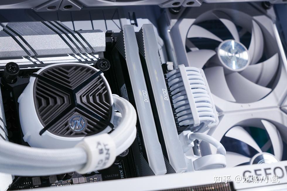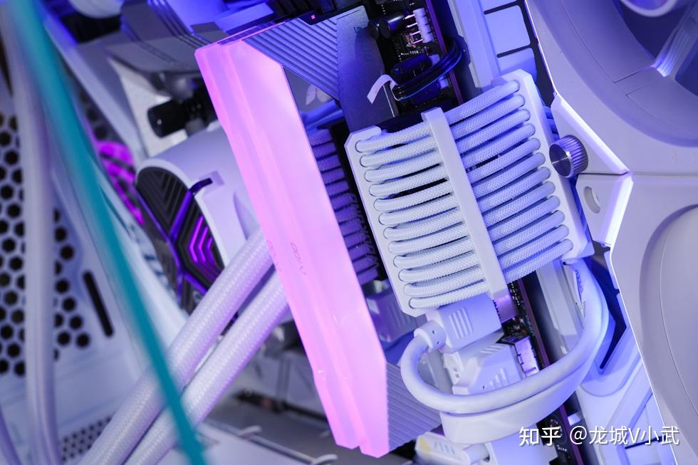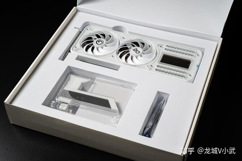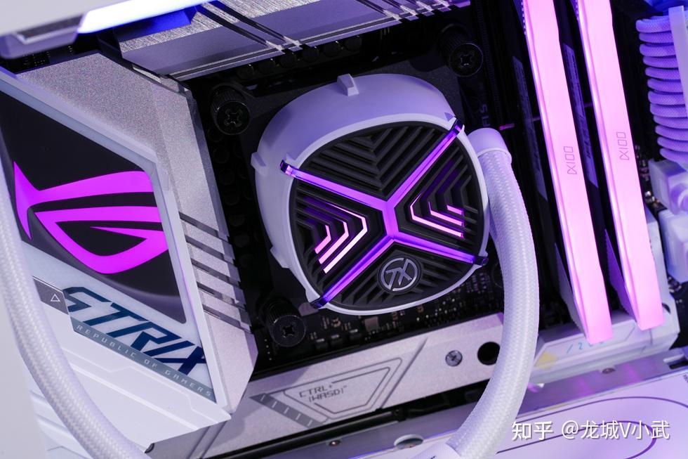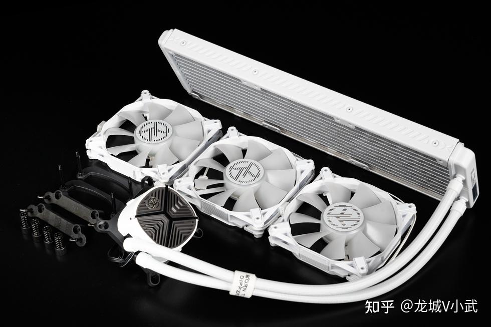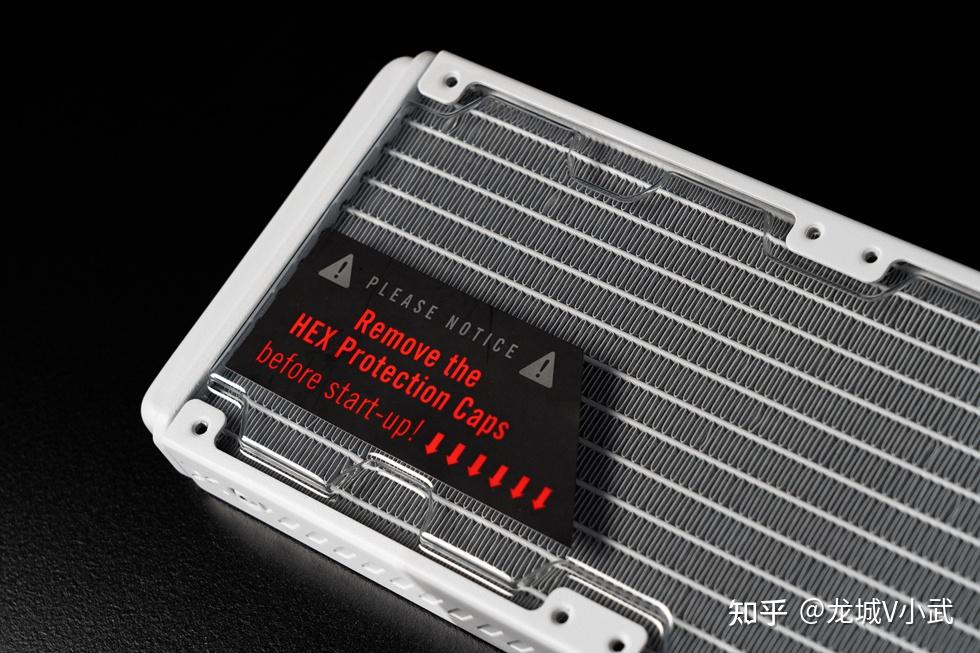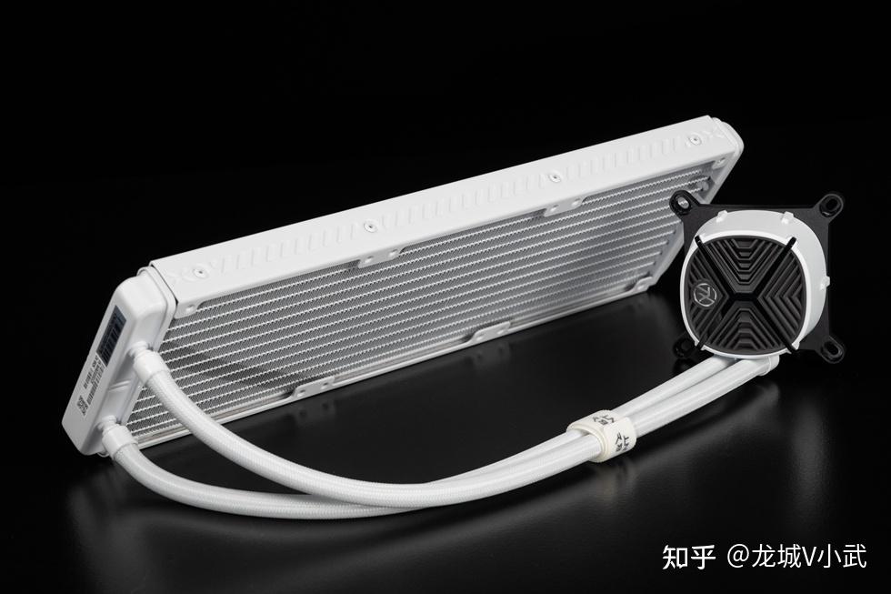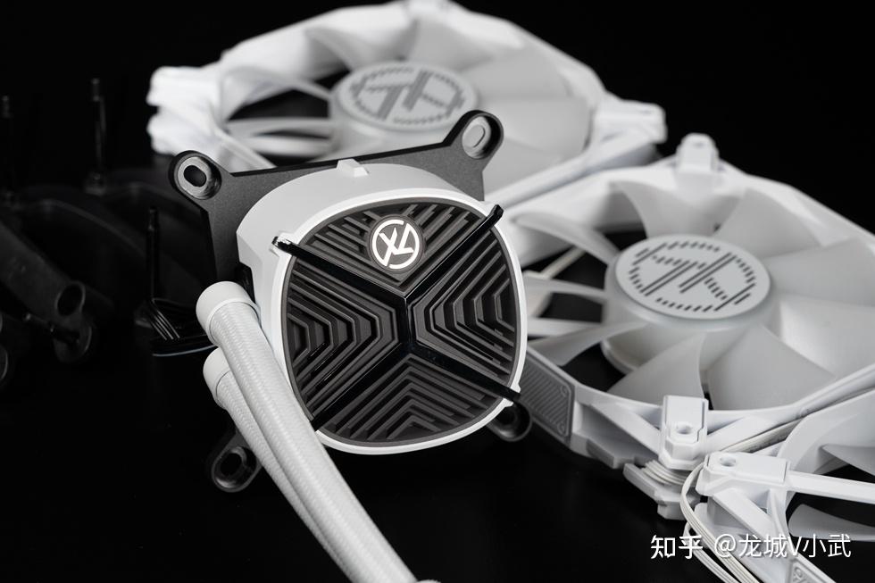 散热器的冷头设计很有特点,配合日蚀灰和月光白的冷头设计拼接和配色,以及独特的X造型,整体质感非凡。