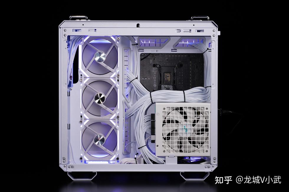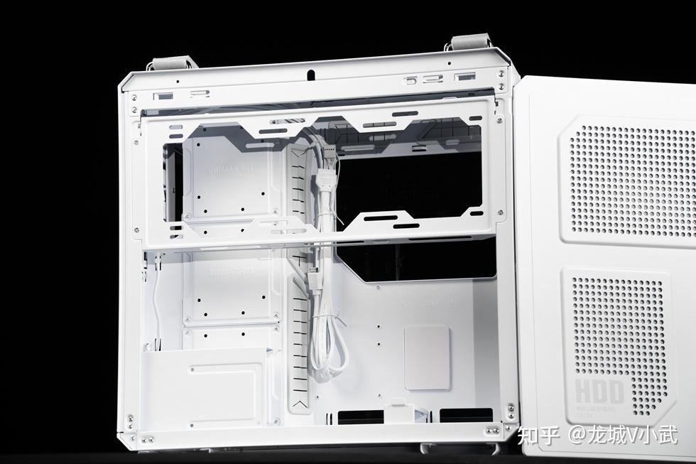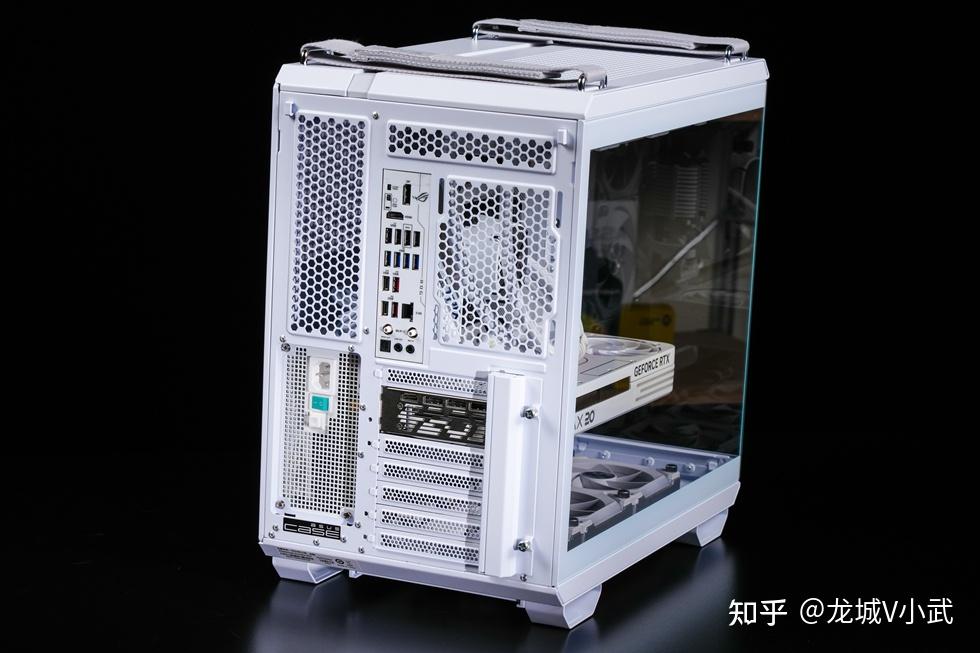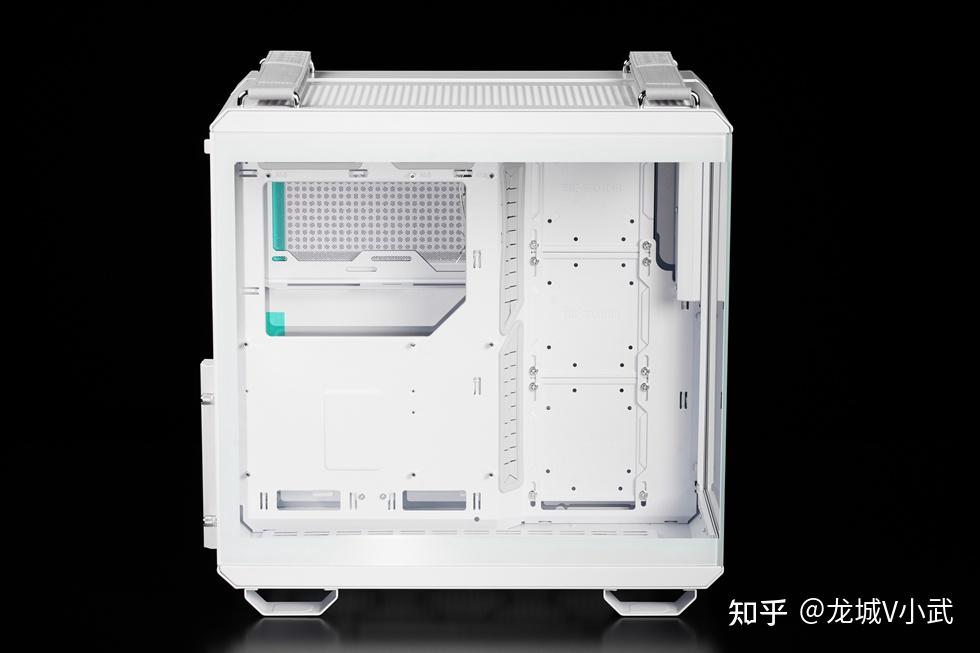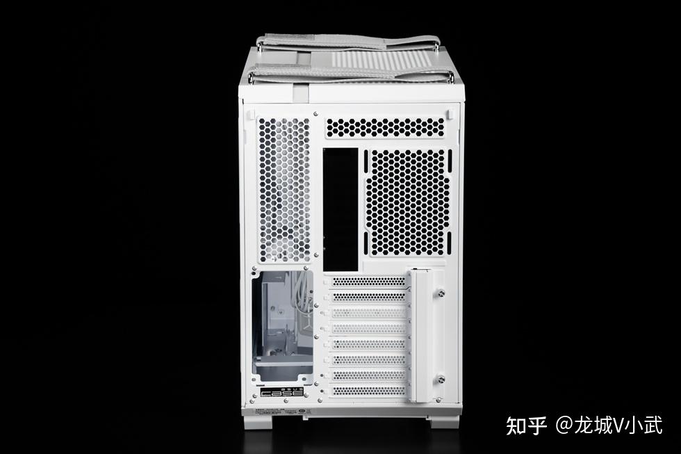 从机箱后部可以看到,这款机箱还采用了左右双仓结构设计。左侧用于安装和展示散热用的主板、显卡和CPU,右侧用于安装电源、硬盘和风扇等。,从而增强兼容性并提高风道的效率。