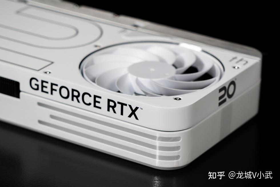 显卡背面是全金属背板,底部的银色装饰条相当有质感。可以看到尾部还有一个反向风扇,相当于升级了公版显卡的散热方案。值得一提的是,背面的风扇和背板上的“2”图标共同组成了“20”字,突出了二十周年的纪念意义。