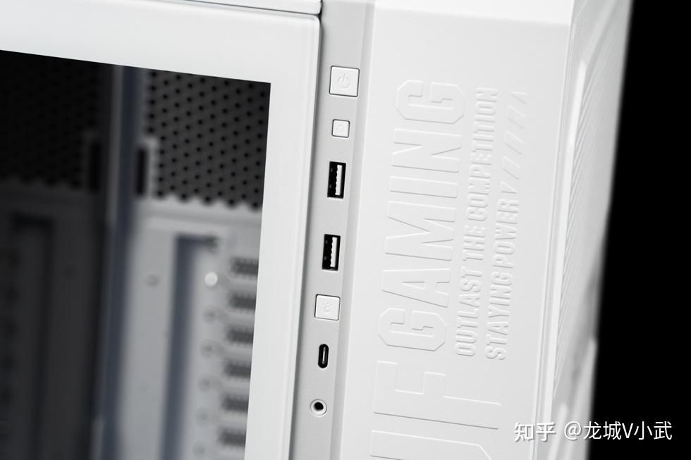 机箱的I/O接口位于前面板的中上部,从上到下依次是“电源按钮、重启按钮、两个USB3.2 Gen 1 Type-A接口、灯光控制按钮、一个USB3.2 Gen2Type-C接口和3.5mm音频接口。