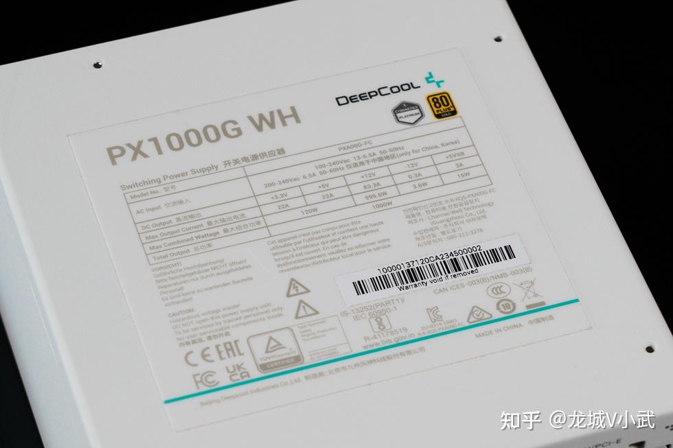 九州风神PX1000WG电源额定功率为1000 W,采用有源PFC+全桥LLC谐振+同步整流+DC至DC结构,支持100V至240V交流输入,+12V设计为单路输出,额定输出电流为70.8A,相当于849.6W功率。+5V和+3.3V从+12V通过DC传输到DC,每个通道的最大输出为22A,组合输出功率为1000W。