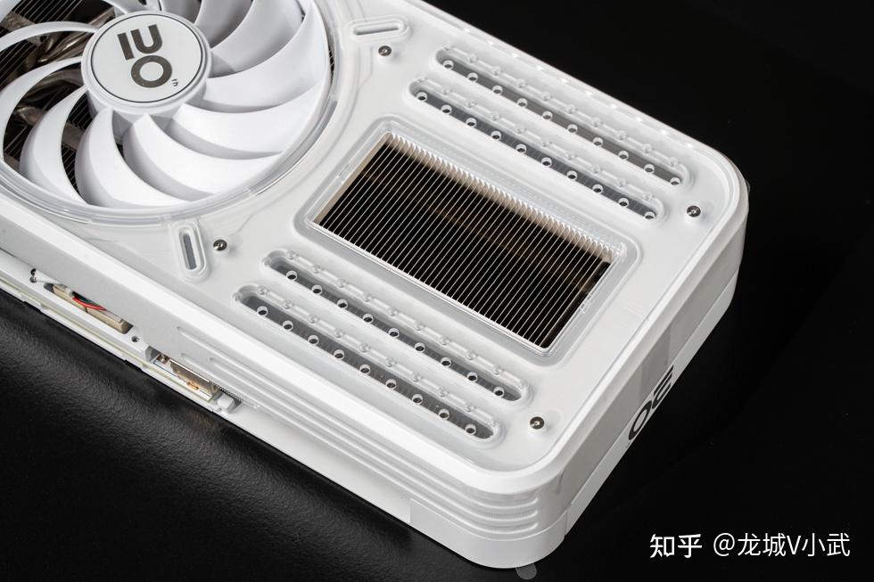 显卡顶部右侧、显卡正面镂空位置、风扇周围和散热鳍片周围都内置了ARGB灯条,通电后的灯光效果非常炫酷。