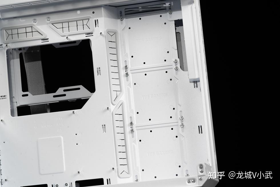 右侧板采用一体冲压方式分为三个区域(硬盘区、电源区和冷排风扇区),布满密集的散热开口,内部覆盖磁性防尘网,在加强散热和防尘方面毫不含糊。